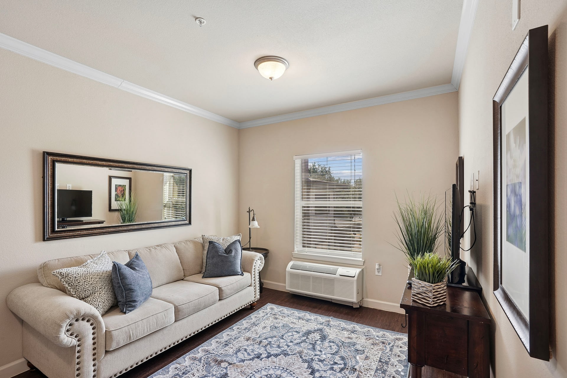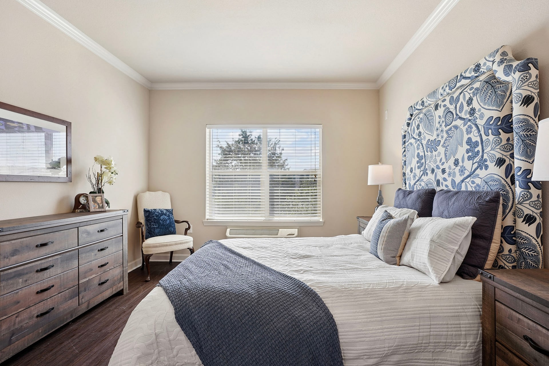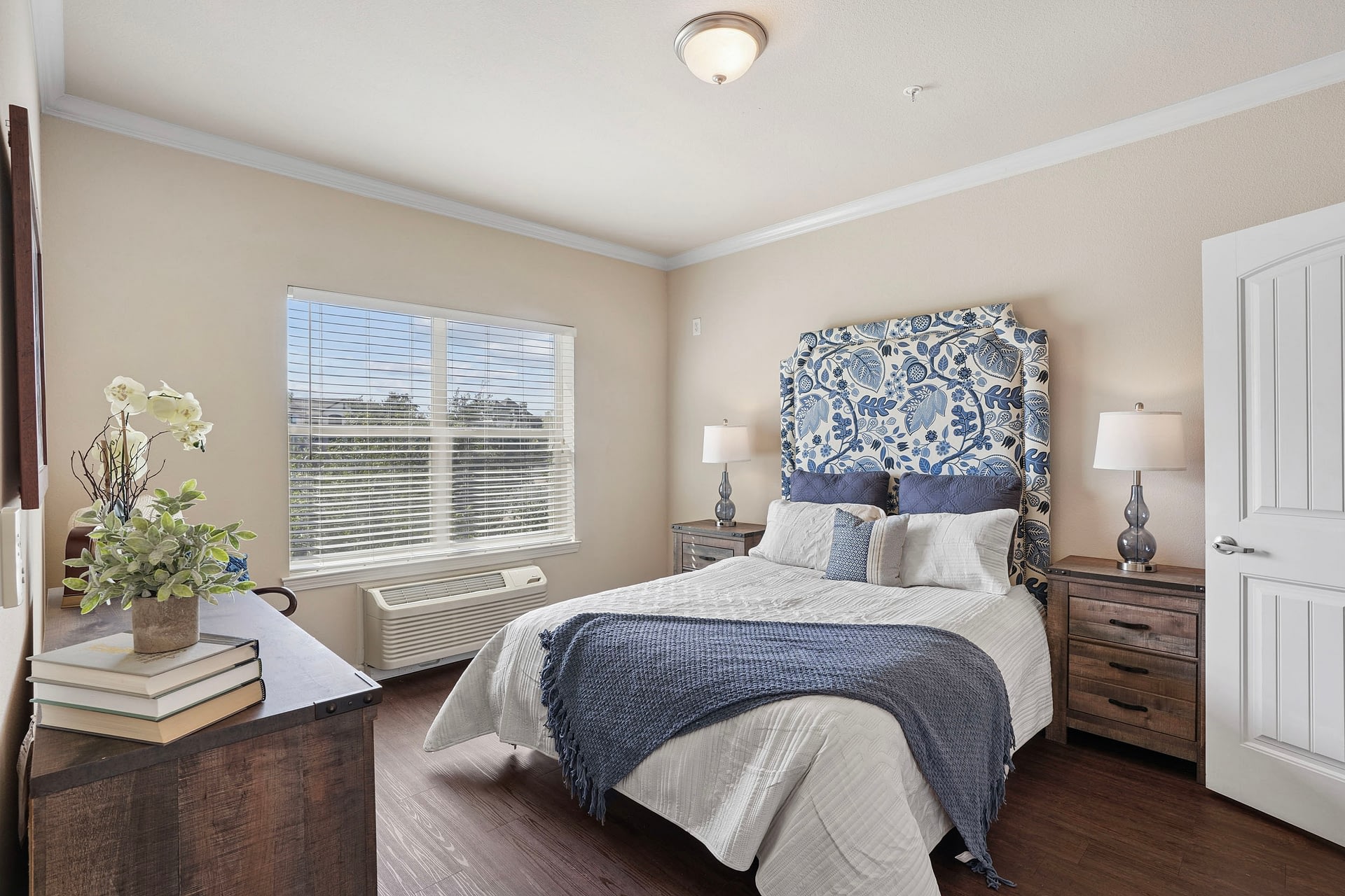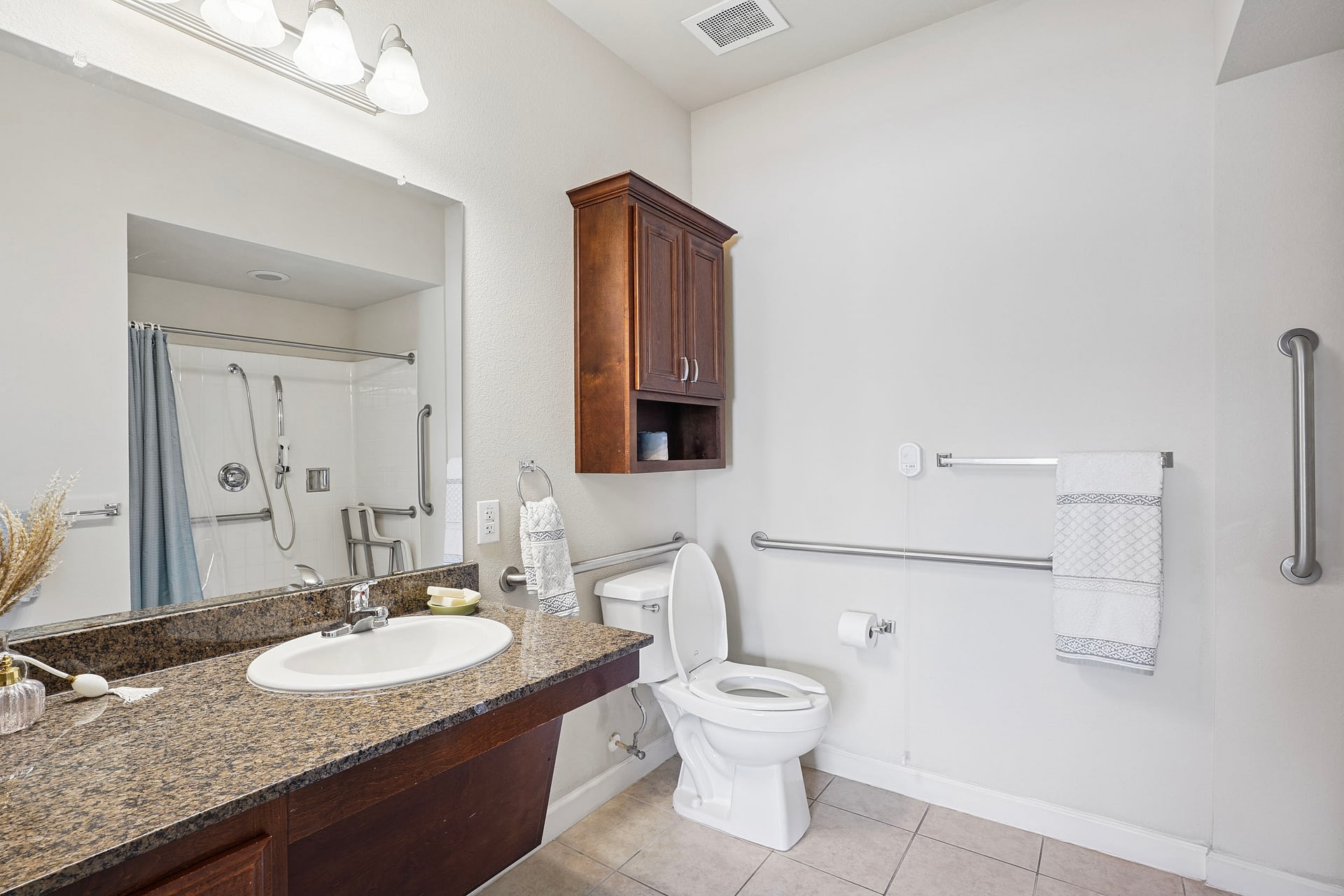Every residence includes modern finishes, spacious layouts, and features that make daily living safe and enjoyable. Apartments may include kitchenettes or full kitchens, granite countertops, and custom cabinetry, along with private bathrooms equipped with accessibility features. Large windows fill each space with natural light, while walk-in closets and built-in storage ensure everything has its place.
