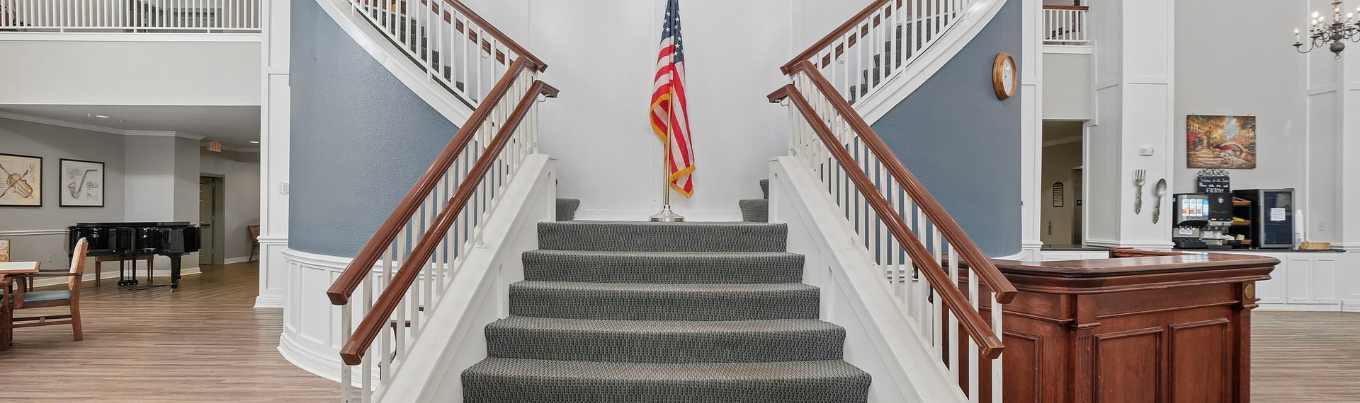 Elegant staircase with a carpeted runner leading to a second-floor landing, featuring a decorative railing and an American flag displayed at the center. The background includes a spacious lobby area with wooden flooring, a piano, and a reception desk, showcasing a welcoming atmosphere.
