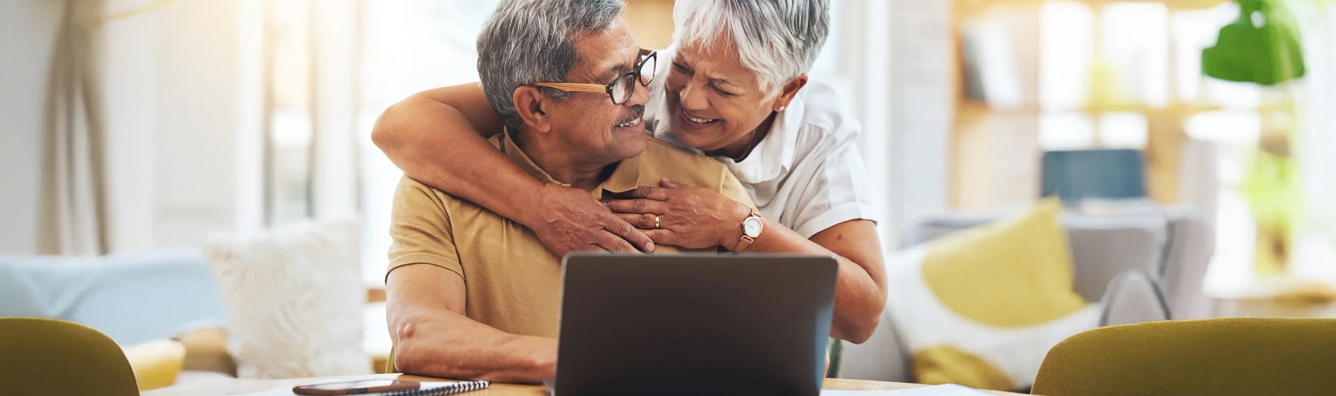 Happy senior couple using laptop at home
