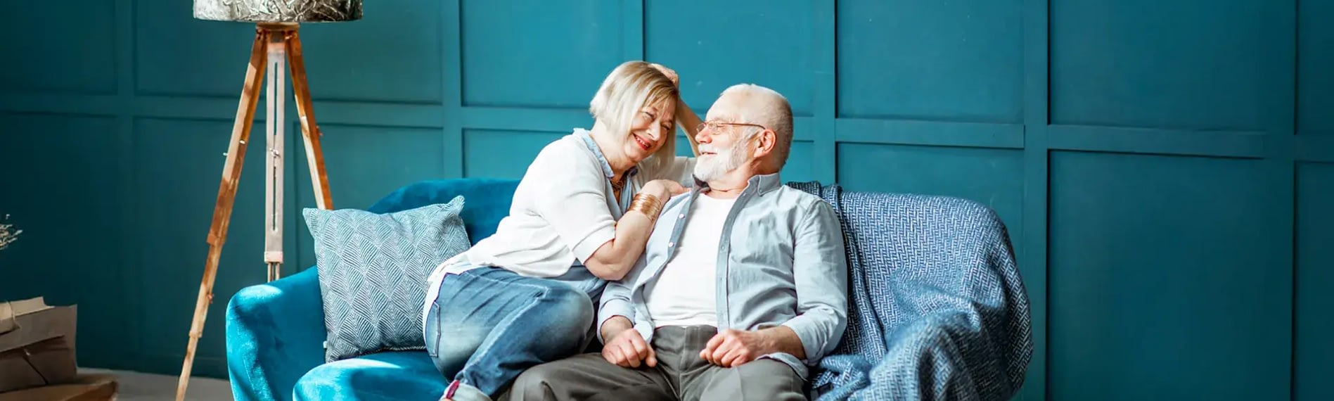 Happy couple laughing on blue sofa